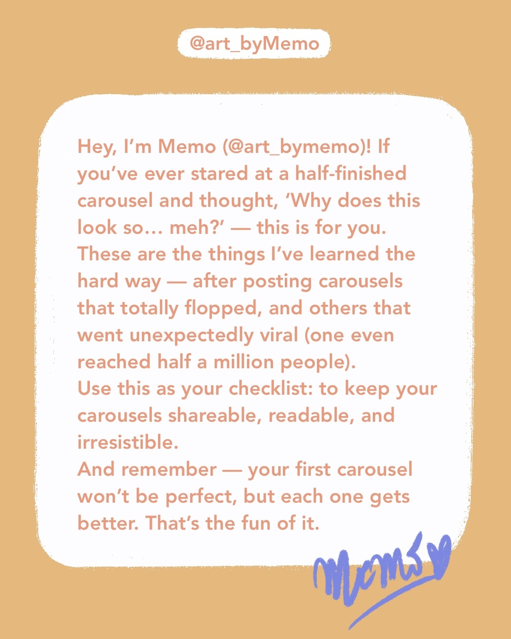 I made this as a teaser for my Skillshare mini class, How to Create a Killer Carousel for Your Art Account. In the class, I show my exact step-by-step process, design lessons (including some embarrassing fails 👀), and how I optimise captions, alt-text + timing to boost reach. Students also get the extended version of this cheat sheet.